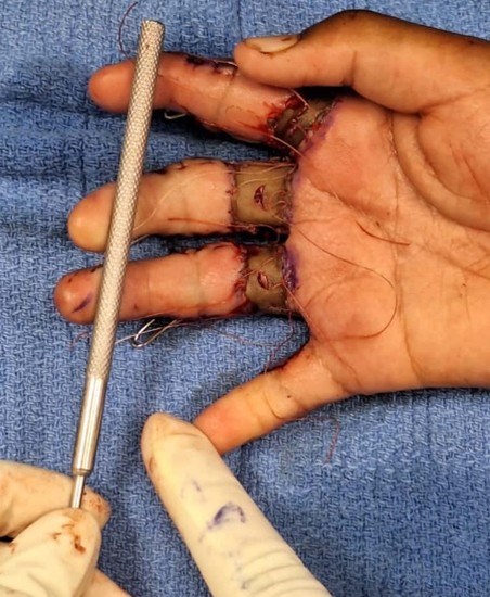 - Zone 5 extensor + flexor reconstruction with grafts + median and ulna nerve grafting (2 year old saw injury)
