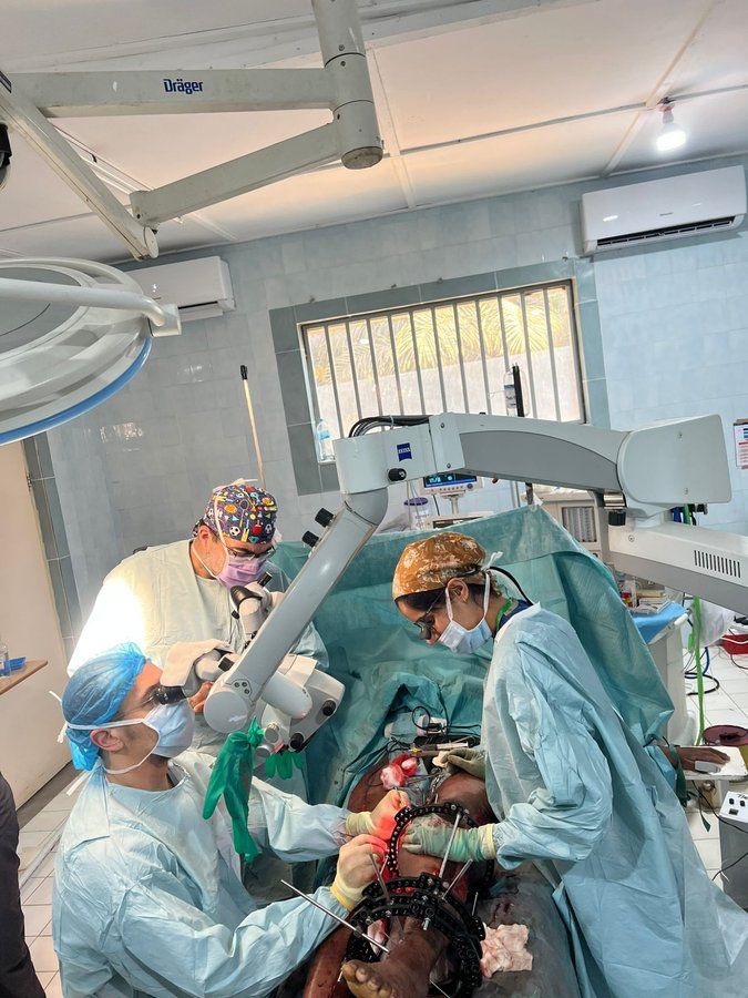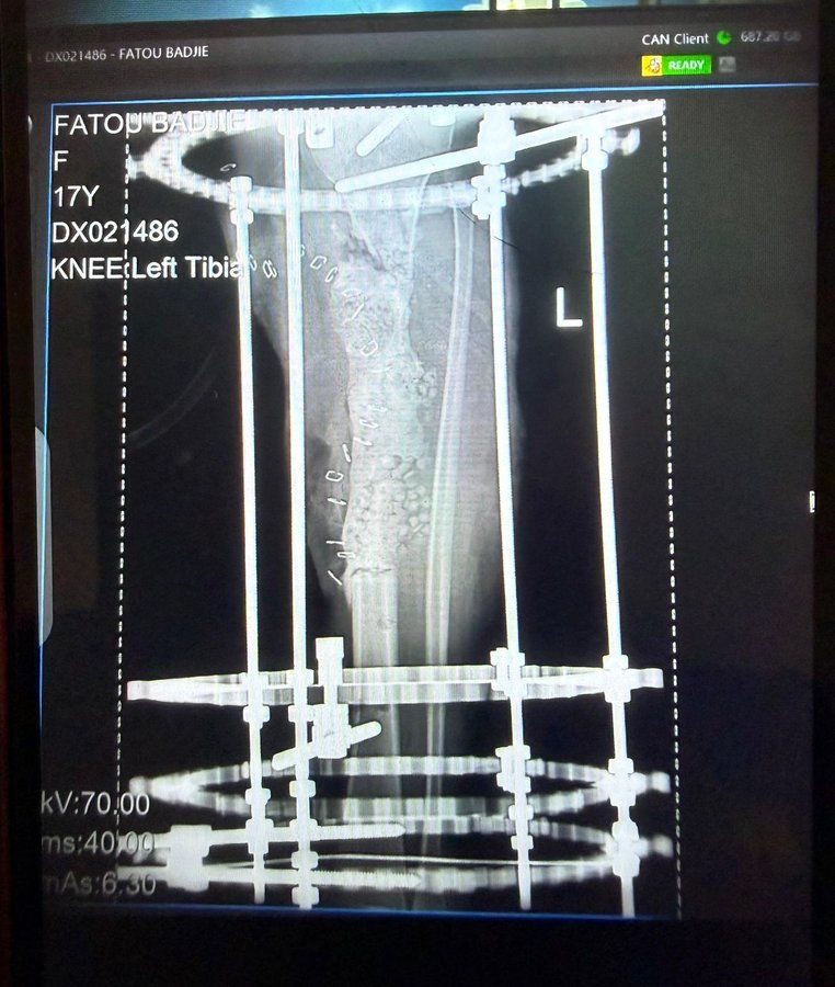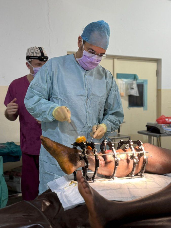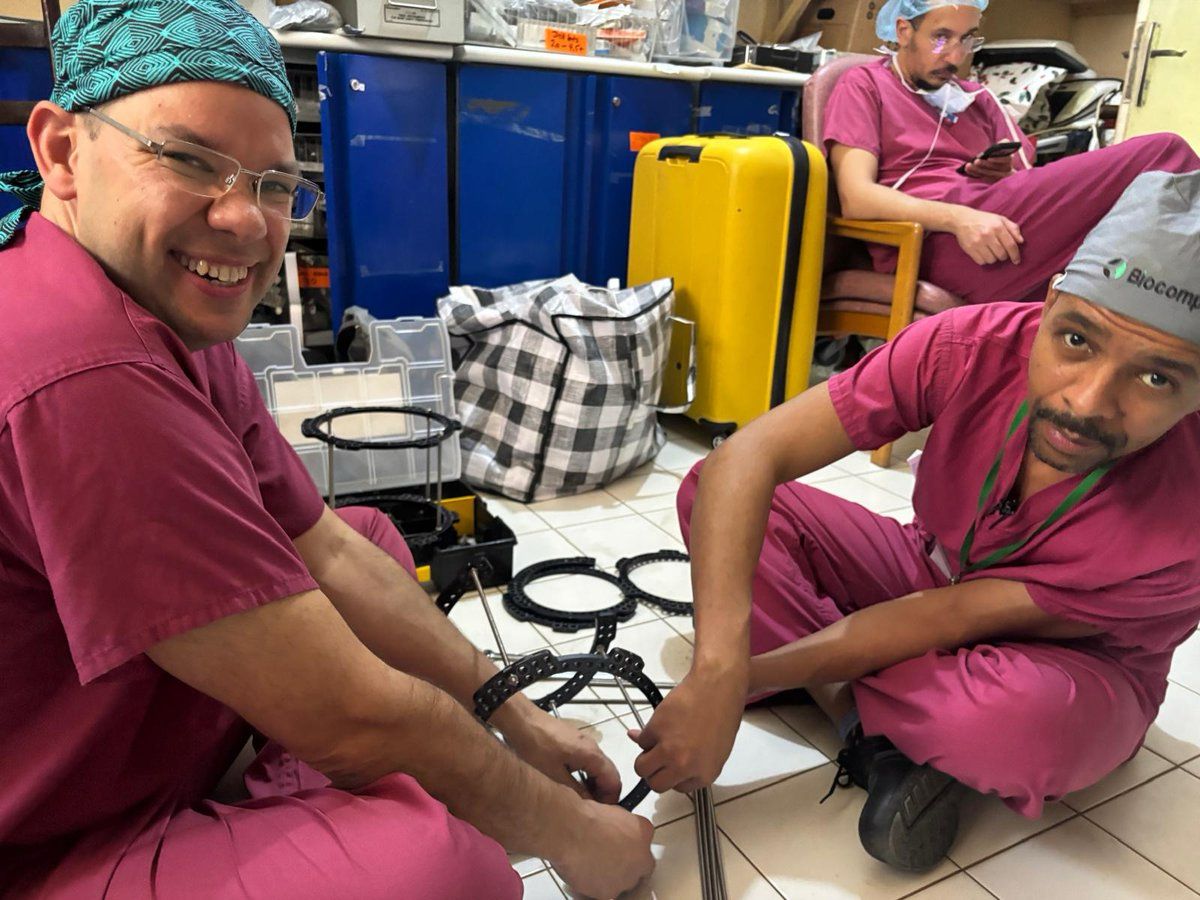 The most clinically significant and technically demanding case of the mission involved a 17-year-old female presenting with a severely comminuted open tibial fracture of the left leg. The wound had remained open for seven weeks prior to the mission. Preoperative imaging – doppler - confirmed a single-vessel limb — a profoundly hostile reconstructive environment — with extensive soft tissue loss overlying the fracture site and 15 cm segmental bone loss. Free flap reconstruction was the only viable option to salvage the limb and avoid amputation.